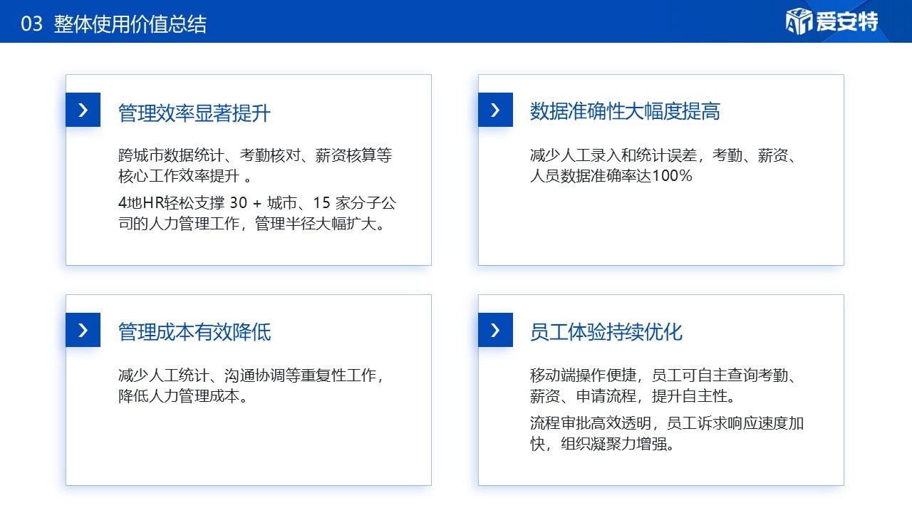 更进一步,i人事系统的“智搭云”平台展现了强大的柔性扩展能力。爱安特借此自主搭建了从入职登记到研发工时管理等各类业务应用,实现了核心业务流程的线上化与标准化闭环。该平台出色的数据追溯与跨表计算能力,不仅能还原历史组织快照,更能精准支撑如研发人力成本核算等复杂场景,最终在提升运营效率与数据准确性的同时,有效降低了管理成本,并持续优化了员工的全方位体验。